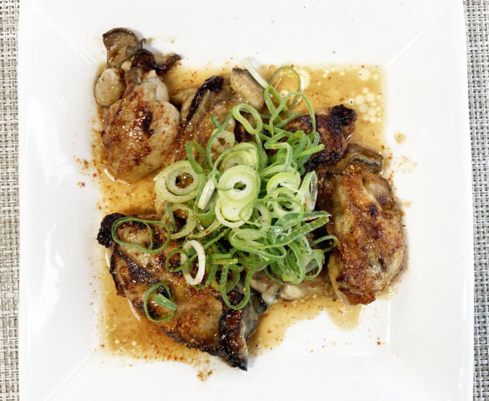 牡蠣を皿に盛り、上に青ネギをのせ一味唐辛子をたっぷり振っていただく。
