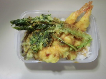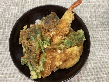 3.ご飯を盛り、たれを少々かけ、天ぷらを乗せ残ったたれをかけて完成。