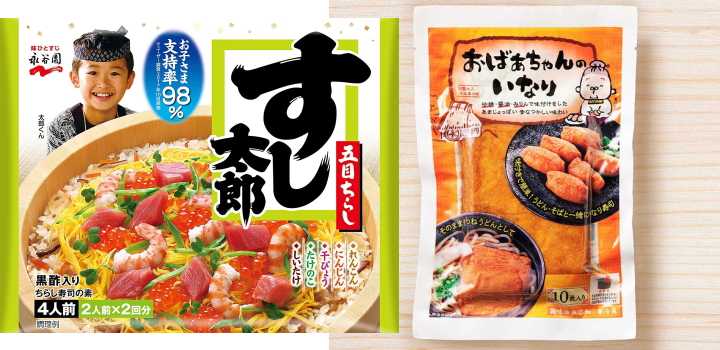 永谷園の「すし太郎 五目ちらし」と富ばあちゃんの「いなりあげ」を使えば簡単に美味しい「五目いなり」ができます。