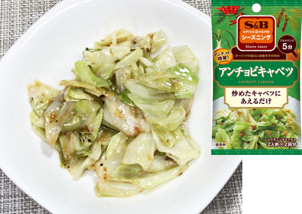 フライパンで5分。炒めたキャベツにあえるだけ。アンチョビと魚介系原料を増量し、コク深い味わいがアップしました。ガーリックの旨みと赤唐辛子の辛みがクセになる味わいです。2人前×2回分。
