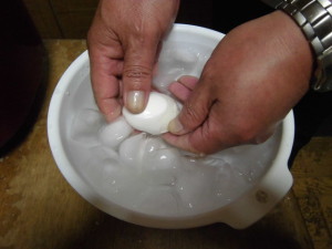 - この間にボウルにたっぷり氷を入れた氷水を作っておきます。湯で上がった卵を急速に冷やすためです。これをやらないと殻剥きが難しくなります。