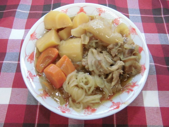 - そこへ煮汁を全部入れ煮立ったら、じゃがいもを鍋の片側に寄せ、下茹でしたにんじん、結びしらたき、残りの玉ねぎを揃えていれる。