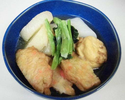 いろいろ試してみましたが、さつま揚げは紀文の「野菜てんぷら」が一番美味しかった。今回は息子が好きな「がんもどき」を入れましたが、なんか合わないような…。小松菜は口直しという感じで添えました。さっぱりするので結構合うと思います。また、最後にゴマ油を回し入れますが、コクが出ます。