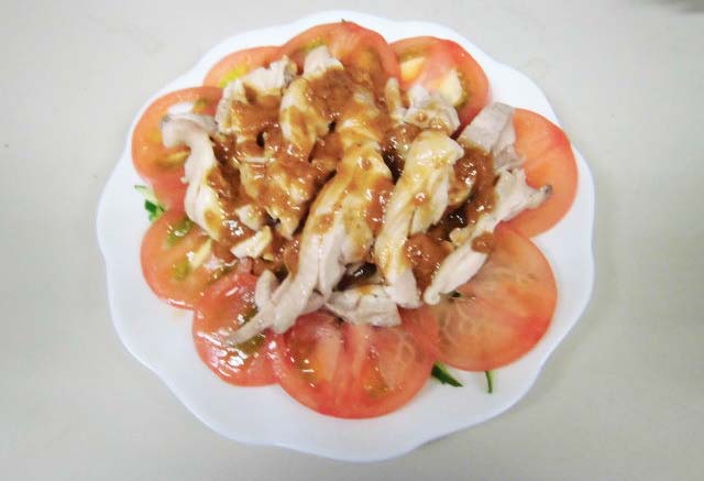 白練り胡麻は1人だと使いきれないので、今回は「丸美屋の棒棒鶏のたれ」を使いました。あまり美味しいとは言えませんが、コスパを考えてこれにしました。