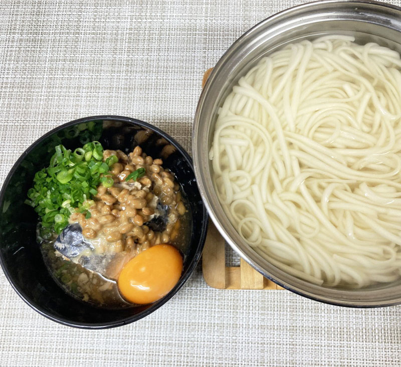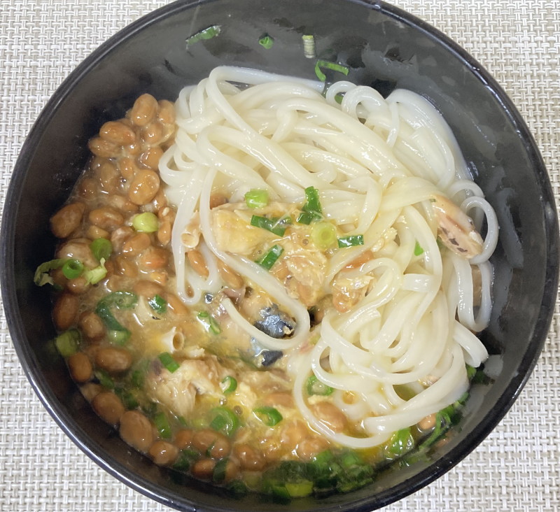 「サバの水煮缶詰」と「納豆」という手軽さがいいですね。うどんも茹でたまま鍋ごと食卓に出すのでで簡単です。