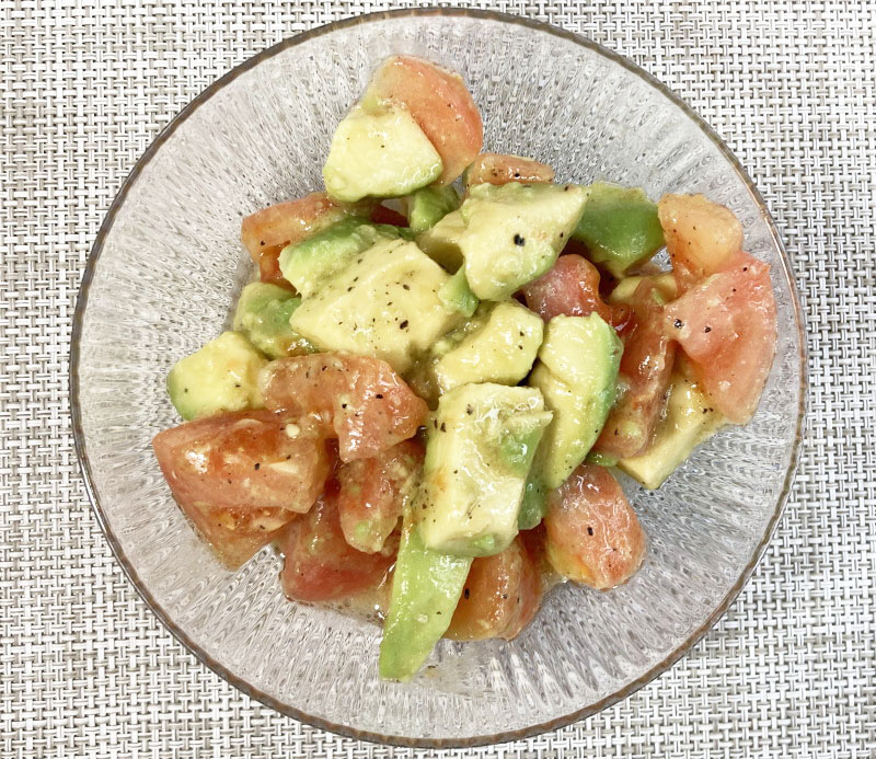 材料のトマトとアボカドが1個ずつだとトマトがかなり大きく感じましたのでトマトを半分にしました(上の完成写真)が、食べてみるとアボカドの甘さが勝ってしまいます。やはりトマトは丸々1個使った方が良いようです。