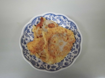 イワシの梅しそ天ぷら前項で紹介した「イワシ竜田揚げ」とほぼ同じですが、チューブの練り梅を使い、衣は市販の天ぷら粉を使いました。とても簡単です。材料・イワシ・大葉・練り梅(チューブ)・市販の天ぷら粉作り方イワシ適量を鮮魚売り場で三枚おろしにしてもらう。皮はひかなくも大丈夫。イワシの身の方に大葉を1枚のせ、その上にチューブの練り梅を1㎝程度のせる。②のイワシを頭の方からきつく巻いていき、爪楊枝でしっかりととめる。天ぷら粉で指定された水の量より2割程度多い水で天ぷら粉を溶く。サラダ油を170~180℃に熱し、③を④に絡め垂れるような余分の衣を落とし、油に投入する。泡が小さくなり色付いたら(4~5分程度)、網バットの取り出し油を切り完成。天つゆでいただきます。 ツイートこのページの先頭へ戻る Top Menu