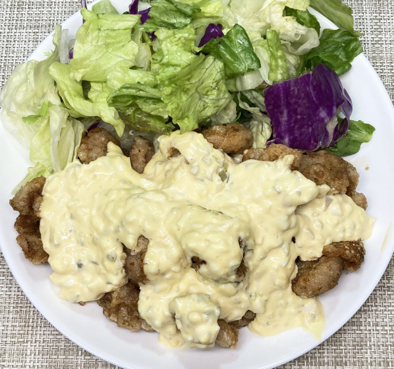 チキン南蛮材料(1人分)・鶏もも肉 …… 半身(150g位)<ブライン液>A:水 …… 100mlA:砂糖 …… 5gA:塩 …… 5g<バッター液>材料と作り方はこちら・片栗粉 …… 適量<甘酢だれ>B:しょう油 …… 大さじ1B:砂糖 …… 大さじ1B:酢 …… 大さじ1~1.<タルタルソース>材料と作り方はこちら作り方タルタルソースを作る。(材料・作り方)Aを合わせブライン液を作る鶏肉を好み大きさに削ぎ切りし、ブライン液に漬ける。最低1時間、出来れば一晩漬け込む。Bを混ぜ合わせ、600Wのレンジで1分30秒加熱し、甘酢タレを作る。バッター液(作り方・材料)を作る。③の鶏肉の水気を拭き取り、バッター液にくぐらせ、片栗粉をまぶす。天ぷら鍋またはフライパンに油を150~160℃に熱し、⑥の肉を片面2分ずつ揚げてバットに取り出し、5分間余熱で火を通す。揚げ油を180~190℃まで上げ、⑦を投入し色付くまで揚げる(1分程度)。器に揚げた鶏肉を盛り、甘酢、タルタルソースをかけ完成。 ツイートこのページの先頭へ戻る Top Menu