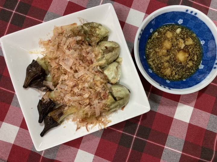 ナスの素揚げ材料・ナス ・ポン酢(あれば柚子ぽん酢) ・サラダ油・トッピング(ねぎ・みょうが・大葉・大根おろし等)作り方ナスはヘタを取り、縦半分に切り皮面に5mm幅に斜めに切り込みを入れる。それを3等分に切る。トッピングを切っておく。揚げ油を180℃に熱し、ナスを短時間でカラッと揚げ、油切りをしておく。器に③を盛り、トッピングを乗せポン酢を回し入れて完成。 ツイートこのページの先頭へ戻る Top Menu