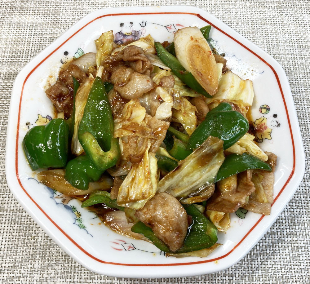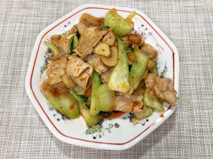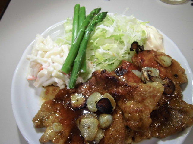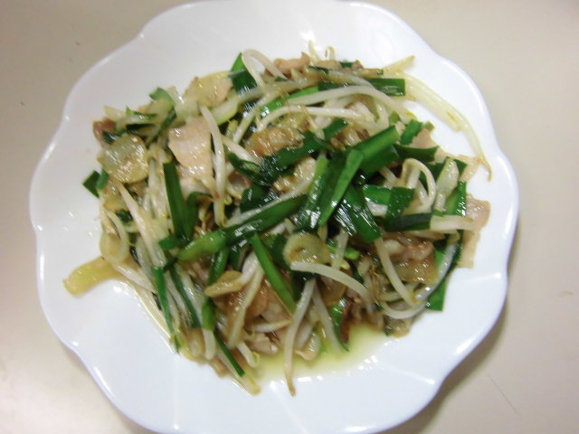 豚肉の塩にんにく鉄板焼き※写真では野菜が多いですが、キャベツの量を大幅に間違いました。本来ならもっと野菜が少ないです。材料(1人分)<野菜炒め>・もやし …… 150g・キャベツ …… 50g・ごま油 …… 少々A:塩 …… ふたつまみA:味の素 …… ひとつまみA:こしょう …… 少々<肉炒め>・豚バラ薄切り …… 145gB:鶏がらスープ …… 90mlB:にんにく …… 1片B:しょう油 …… 小さじ1/2B:塩 …… 小さじ2/3B:味の素 …… 小さじ1/2B:一味とうがらし …… 小さじ1/2作り方豚肉は4cm幅に切る。キャベツは一口大に切る。にんにくは、すりおろす。(チューブで5cm~10cmでも可)鶏がらスープを作っておく。(粉末を茹で溶いても可)鉄板を温めておく。なければ普通の皿でも可。鍋に湯を沸かし沸騰したら火を止めて、豚肉がバラバラになるように軽く湯がいてザルに取り出し水気を切る。中華鍋(フライパンでも可)を強火に熱し、サラダ油をなじませたら、もやし・キャベツ・Aを入れ炒める。最後に、ごま油で風味づけしたら、鉄板に取り出す。中華鍋に中火でサラダ油をなじませ、④の豚肉をとBを入れ炒め合わせる。鶏がらスープがふつふつとしたら火を止め、鉄板に盛り付けて完成。好みで小ねぎを散らす。※出来上がり時の水分がかなり多いです。盛り付けの時、水分を除外しても良いかも…。 ツイートこのページの先頭へ戻る Top Menu