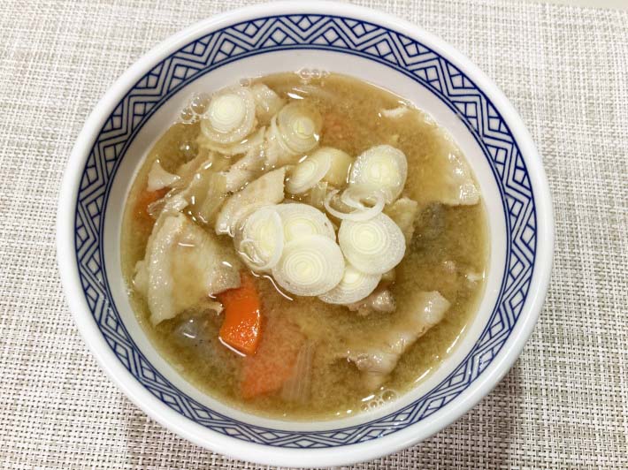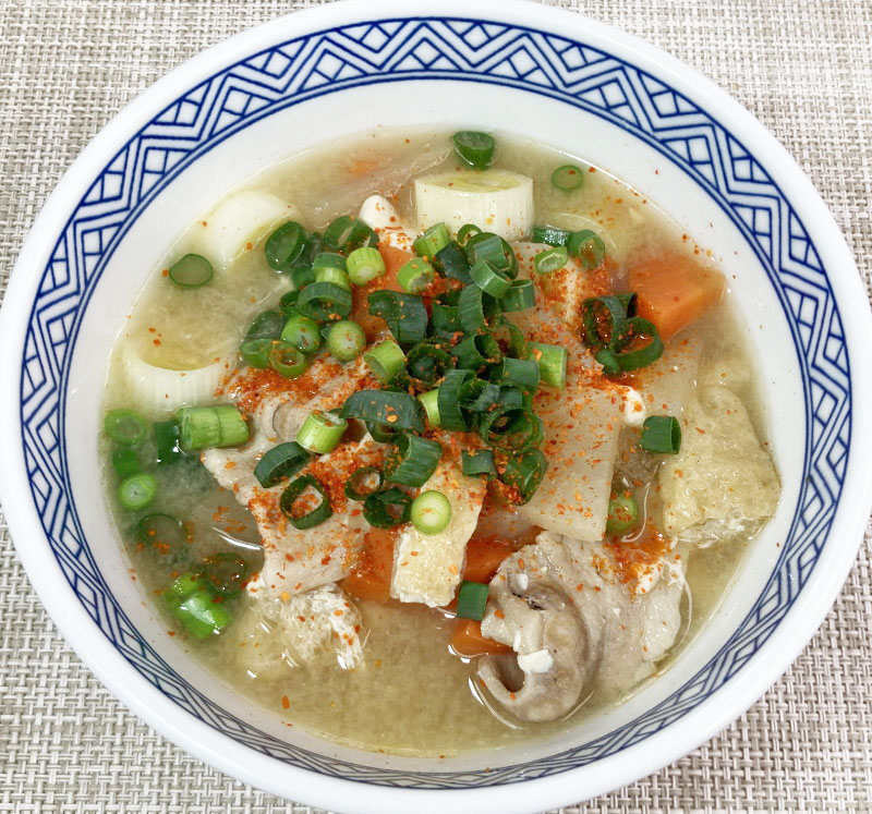 かつや風「豚汁」かつやの豚汁って美味しいですよね。いつもは自分なりの豚汁を良く作るのですが、今回はかつや風にしてみました。材料(3~4人分)スライス豚バラ150~200g大根100g人参1/2本コンニャク小1個玉ねぎ1/4個じゃが芋小1個水1,000ml白系味噌大さじ4前後青または白ネギ適量七味または一味唐辛子適量作り方豚バラを4㎝幅に切る。大根・人参は皮をむき5mm厚の銀杏切りにする。玉ねぎは櫛型切り、ジャガイモは小さめに、コンニャクは5mm厚の短冊に切る。鍋に水を張り大根、人参、コンニャクを入れ20分ほど経ってから豚バラ、玉ねぎを入れアクを取りながら10分煮る。※この間に水が減っていくが追加しない。④に味噌を半量入れ、味を見ながら足していく。器に盛り小口切りのネギ、唐辛子をかけて完成。 ツイートこのページの先頭へ戻る Top Menu