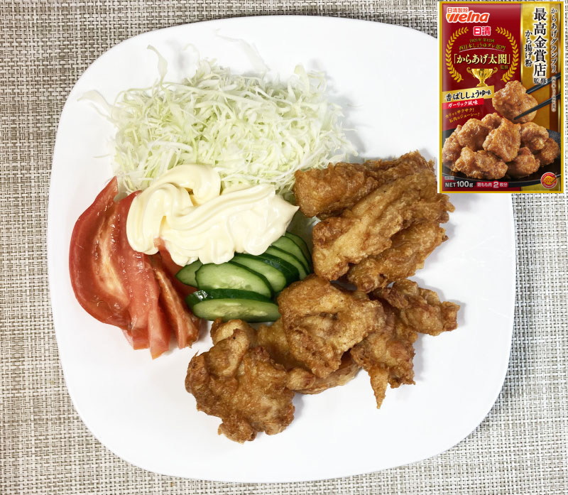 から揚げ(香ばししょうゆ味)日清製粉のから揚げ粉で漬けこみタイプの「からあげ太閤監修の香ばししょうゆ味 ガーリック風味」は、簡単に美味しいから揚げを作ることができます。今回はこの粉を使ってから揚げを作りました。材料(1人分)鶏もも肉 …… 1枚(200~250g)日清から揚げ粉(香ばししょうゆ味) …… 1/2袋(50g)水 …… 50mlレモン・付け合わせ野菜 …… 適量作り方鶏もも肉を一口大(好みの大きさ)に切る。ボウルに「日清から揚げ粉」と水を入れかき混ぜる。②に鶏肉を入れ手で揉み込み、10分間寝かせる。深めの鍋にたっぷり目の油(分量外)を入れ160℃に熱し、③を投入し4分間揚げる。170℃以上にならないように。鶏肉を一旦取り出し、3分間余熱で火を通す。油温を180℃まで上げ、⑤の肉を投入し1分間揚げる。皿に付け合わせ野菜やレモンの串切りとともに、から揚げを盛って完成。マヨネーズを少しつけていただくと美味しいです。 ツイートこのページの先頭へ戻る Top Menu